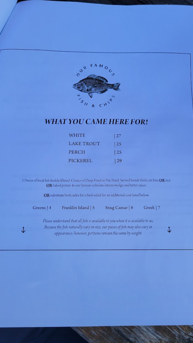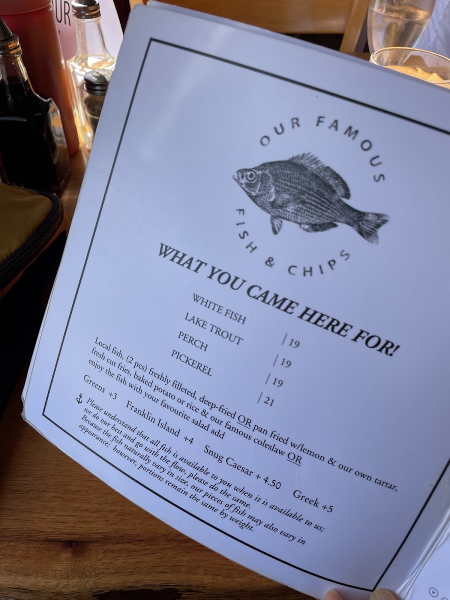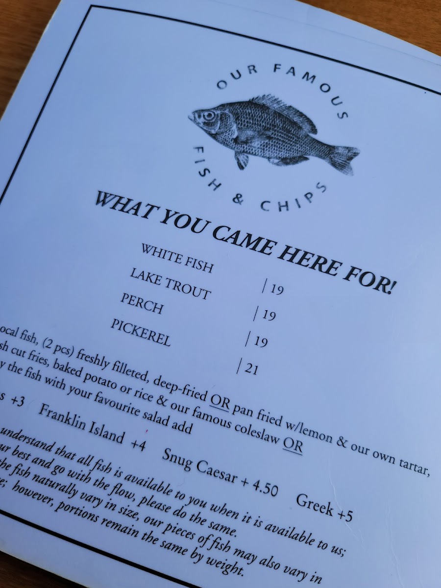 The menu shines with an assortment of expertly prepared dishes featuring local fish, such as the renowned pickerel and trout, cooked to perfection in various styles. Guests rave about the fish chowder and classic fish & chips, made with homemade coleslaw and russet fries. But there's more! Indulge in delightful starters like escargot and calamari.